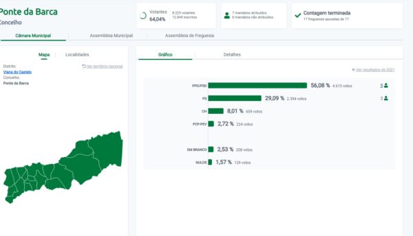 O candidato do Partido Social Democrata (PSD), Augusto Marinho, foi reeleito presidente da Câmara Municipal de Ponte da Barca para um terceiro mandato, ao conquistar 56,08% dos votos.