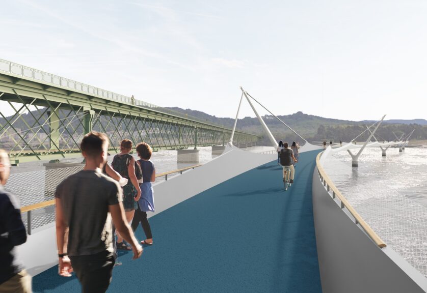 “O traçado em “S” é uma mais valia da solução, não só pelo afastamento à ponte existente, como pelo efeito que provoca na circulação pedonal. Em causa estão vãos com cerca de 60 metros e a superestrutura é do tipo de uma ponte de tirantes multi-suspensão, com um único plano de tirantes e um único tirante por vão”, acrescenta.